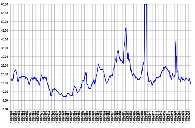 Since 1960, the PE has cycled up and down generally in a range between 15 and 20. The average or mean is around 17.